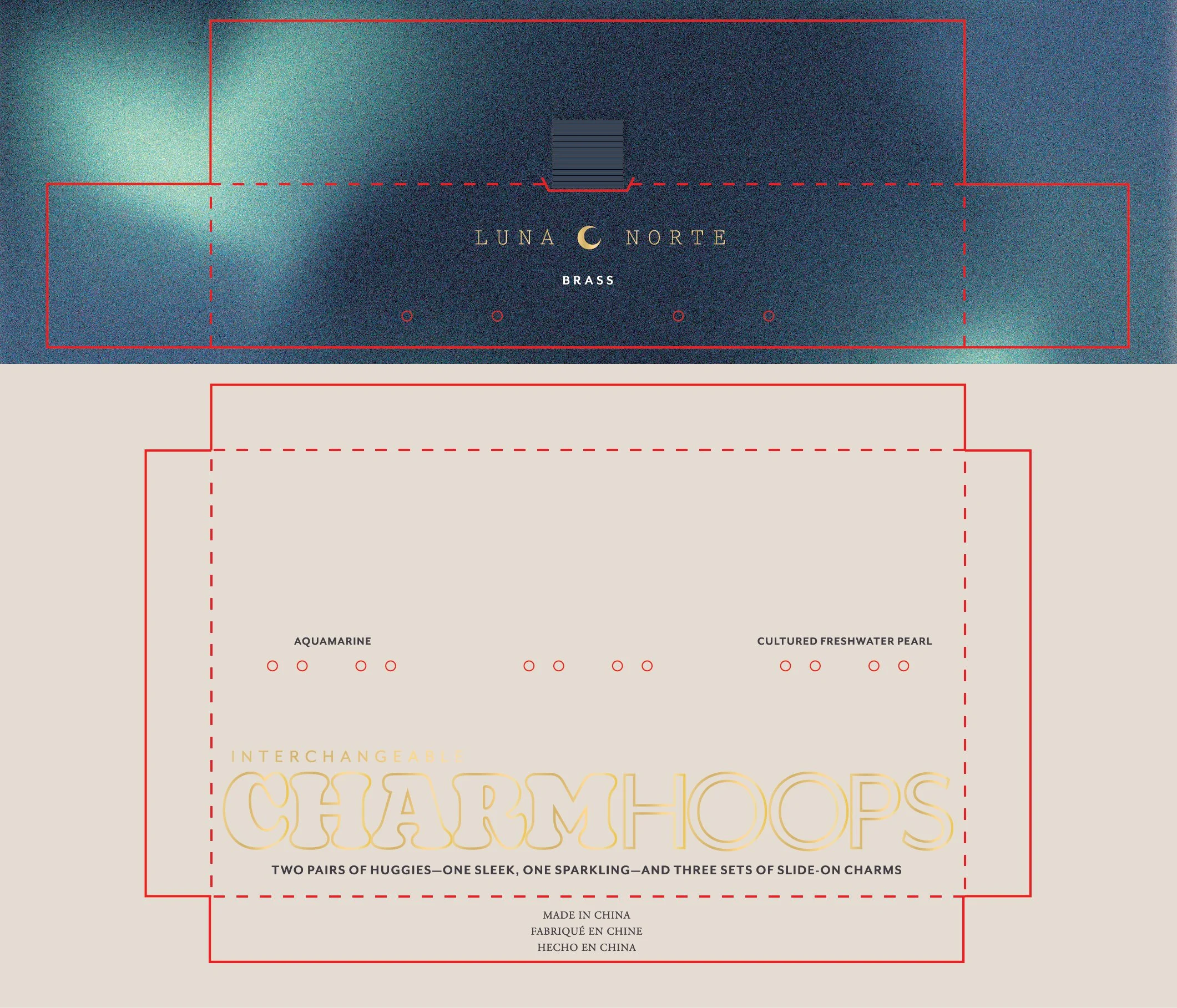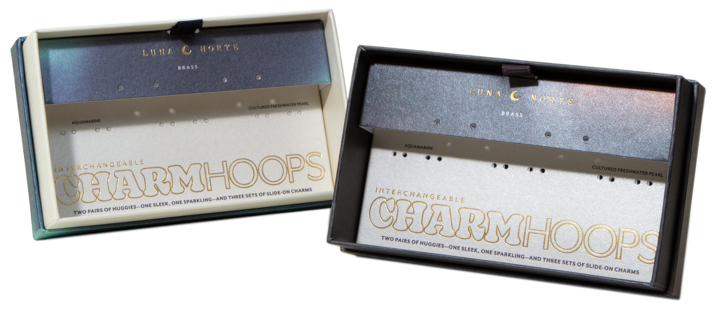 Both tiers are accented by gold foil text and pearlescent paper. The lid is wrapped in a custom Northern Lights-esque gradient that matches the interior upper insert, while the bottom of the box is a creamy off-white that matches the lower insert respectively.