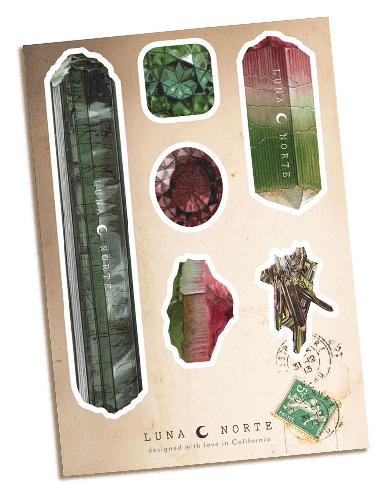 To elevate the seasonal unboxing experience, I designed a cohesive holiday shipping suite that blends classic charm with Luna Norte’s established brand. Pulling assets from vintage gemology books, the holiday postcard features festive archival gemstone illustrations forming an implied Christmas tree, creating a timeless, festive moment right out of the box.